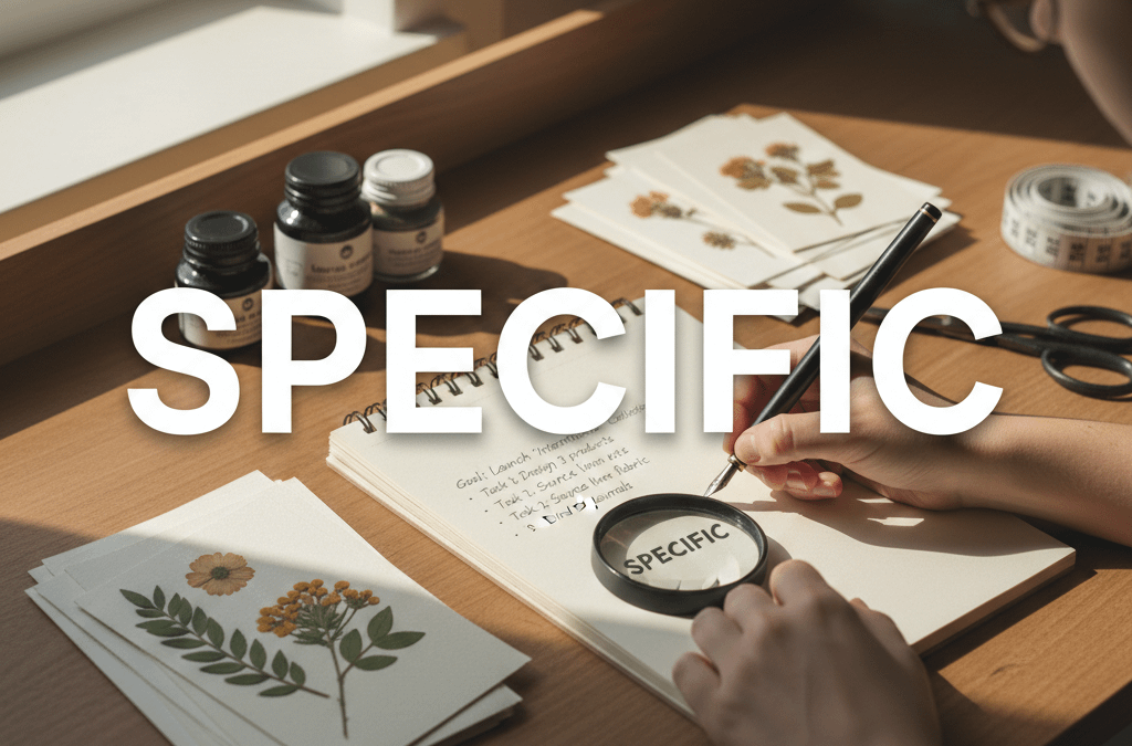 When a goal isn’t specific, your brain doesn’t know what to focus on. For example, in my handmade stationery business, I’ve learned that a goal of “making more journals” is a recipe for procrastination. But the specific goal of ” binding five linen-covered journals on Tuesday morning” gives my energy a clear direction. Specific goals matter because they give your energy a clear direction, reduce decision fatigue, and make it easier to take consistent action. Instead of feeling scattered or overwhelmed, specificity helps you feel grounded and intentional.